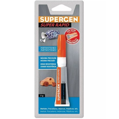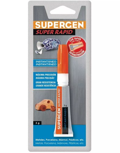Supergen adhesiu instantani transparent. Enganxa en pocs segons amb la màxima força d´unió. Apte per a: metalls, porcellana, marbre, plàstics, goma, vidre, cautxú, fusta, cuir, etc. No apte per a polietilè, polipropilè, PTFE ni silicona.