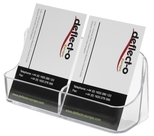 Portatargetes de sobretaula amb dos compartiments verticals i capacitat per a 50 targetes per compartiment, fabricat en poliestirè vidre transparent. Mides: 60 x 125 x 40 mm.