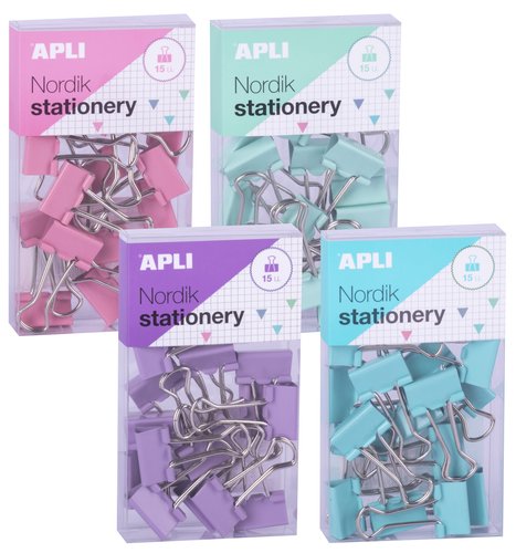 Pinces de pales abatibles de 19 mm. Clips d´alta resistència fets d´acer temperat en colors pastís i amb nanses en acabat níquel. Ideals per mantenir tots els documents ben subjectes i el teu escriptori ben organitzat. Cada caixa conté 15 pinces. Subjecció òptima fins a 50 fulles. Disponibles en 4 colors pastís de la gamma Nordik: rosa, lila, blava i turquesa.