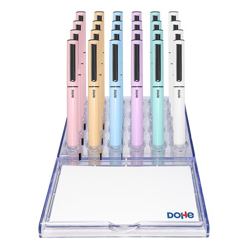Elegants bolígrafs amb base de metall lleuger-cos ovalat en color pastís, que els fan ergonòmics i faciliten el lliscament per a una escriptura perfecta-tinta gel- i punta fina de 0,5mm. Inclou caputxa (amb clip per enganxar) al mateix color que el cos. Fabricats en alumini que alleugereixen el seu pes. Inclouen tinta blava. Mides expositor: 145 x 190 x 115 mm.