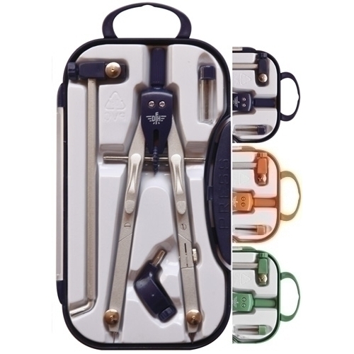 Compàs micromètric amb mines de 2 mm, allargadora, bigotera i un adaptador de rosca. Articulat als dos braços. Longitud: 170 mm. Circumferència de 380 mm.
