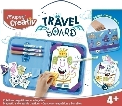 Inventa divertides històries de cavallers i princeses, només has de triar un imant amb el patró que triïs i col·locar-lo al tauler, fes la teva imaginació a volar per completar el teu dibuix a la pissarra i finalment ¡ Esborra i comença una vegada i una altra! Contingut: 1 pissarra blanca, 1 drap, 4 retoladors esborrables en sec i 14 imants, tot en un maletí amb nansa per no perdre res.