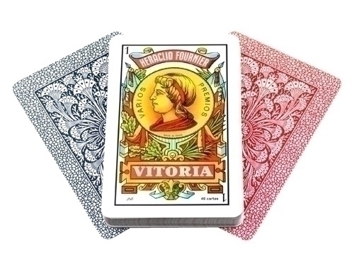 Baralla Model Nº12 Fournier tipus espanyol de 40 o 50 cartes, mida 61X95 mm, amb revers de color vermell o blau i estoig de cel·lofana. Fabricades en cartró de 300 grams.
