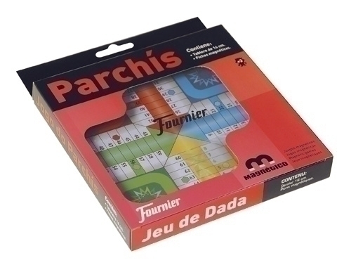 Estoig amb tapa de metacrilat que porta a l’interior fitxes magnètiques, daus i una superfície metàl·lica, on hi ha representades les caselles de color que necessitem per jugar al parxís. Aquestes car