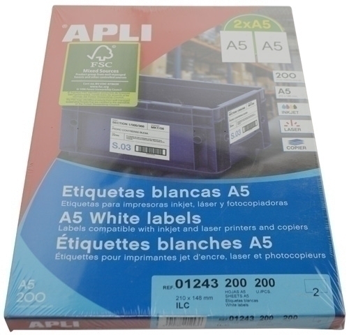 Etiquetes Adh.Impr.Apli A5 Blanca C.Rectes Caixa 200H 210X148 Mm 200 Uts.(01243)