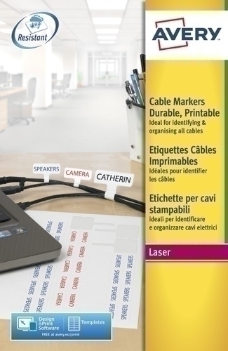 Etiquetes per identificar, recollir i reagrupar els cables elèctrics. Estan realitzades en polièster per resistir l’aigua, l’oli, els raigs UV i les temperatures de -20°C a +80°C. , plàstic, vidre i superfícies pintades. Fàcil d’imprimir amb el programari Avery en impressores làser.