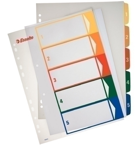 Índex de projectes imprimible de 1-5, fabricat en polipropilè rígid de 300 micres amb portada de 350 micres. Per utilitzar-los, només cal imprimir un full estàndard A4 amb l’ajuda d’una plantilla i col·locar-lo darrere de la pàgina frontal, d’aquesta manera és possible actualitzar-lo sempre que calgui- encara que l’arxivador contingui fundes les pestanyes són visibles. (la plantilla es pot descarregar a: www. esselte.com/projectsystem).