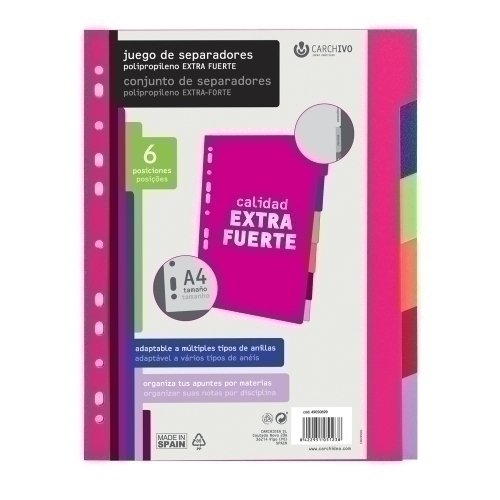 Separadors de polipropilè extra rígid, adaptables a diferents tipus d’anelles en colors assortits. Una petita ajuda per organitzar i separar documents o apunts per color.”