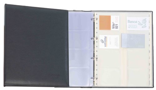 Targeter de tapes encoixinades folrades en símil pell amb 4 anelles de 25 mm-20 fundes amb detall anti esquinçat i índex alfabètic. Un targeter en mida foli amb capacitat per a 320 targetes. Mides: 31