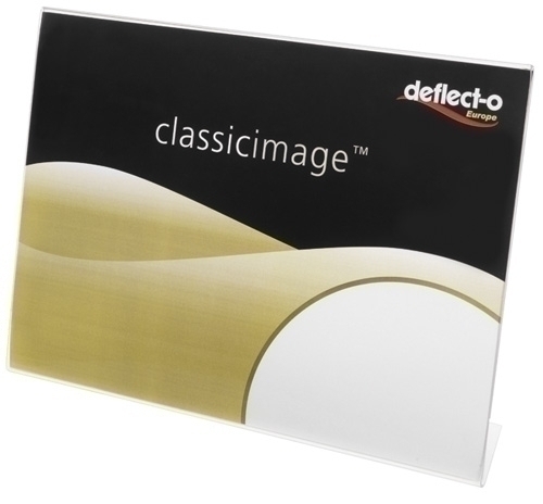 Expositor de sobretaula fabricat en poliestirè transparent vidre en forma de L, amb àmplia base (210 x 150 x 50 mm). El document llisca lateralment.