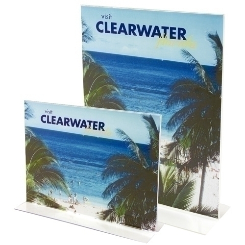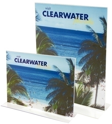 Expositor de sobretaula fabricat amb poliestirè transparent vidre en forma de T, amb àmplia base. El document s’introdueix a la part inferior.