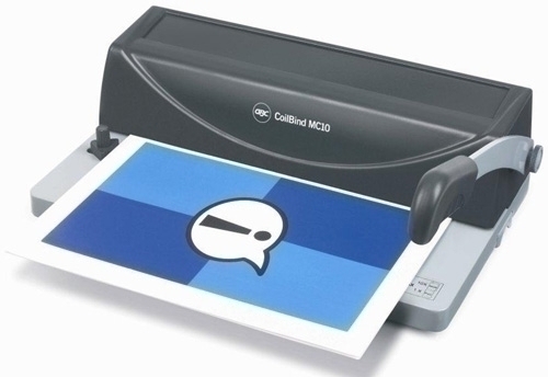 Enquadernadora d’espiral compacta d’escriptori,”per a l’ús ocasional a la llar i oficines. Capacitat de perforació: 10 fulles. Enquaderna fins a 450 fulles. Distància entre forats 5:1. Només per a enq