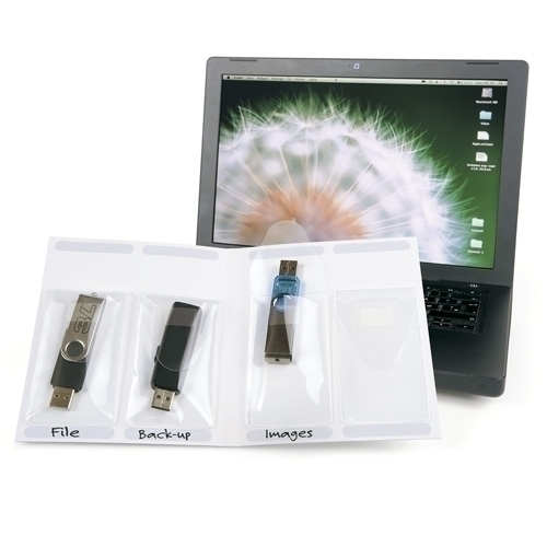 Butxaca antiestàtic de polipropilè de 120µ amb dors adhesiu i solapa protectora. Organitzi, traslladi, trobi i protegeixi de la pols i de la brutícia els seus USB.