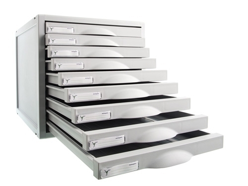Organizador modular de 9 cajones de 22 mm de ancho, con carcasa gris y cajones en color opaco, con unas medidas exteriores de 356 x 316 x 303 mm (fondo x ancho x alto) y con unas medidas de 322x265x22 mm para el interior de sus cajones.