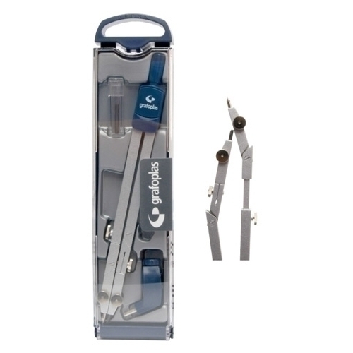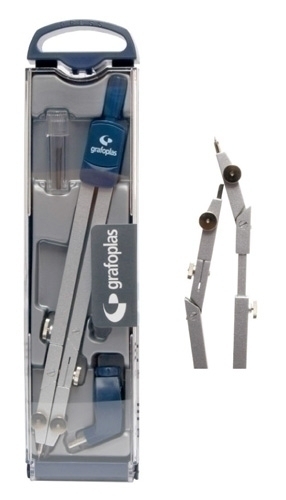 Estuche de plástico con colgador que incluye: un compás escolar de dos brazos articulados, alargadera telescópica, adaptador universal y tubito de minas. Medidas: 155 x 450ø mm.