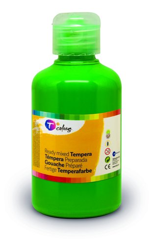 Témpera líquida, en base agua, fácil de mezclar en colores brillantes y resistentes a la luz. Fácil lavado con agua y jabón. Botella dosificadora flexible.