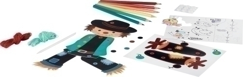 Crea tu propia obra de teatro de marionetas. Tan solo tienes que construir y decorar el espantapájaros articulado y dar color a sus inseparables amigos pájaros. Contiene: marioneta para montar (cartulina decorada y 3 tarjetas para raspar y dibujar), 6 lápices de colores (amarillo, azul, marrón, naranja, rojo y verde), 2 hilos, 1 palo y 1 hoja de anillas adhesivas de doble cara. Edad: + 5 años.