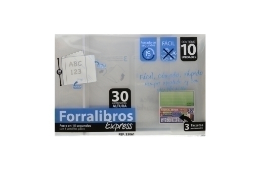 La manera más fácil y rápida para proteger sus libros. Forro protector «ajustable para adaptarlo al grosor del libro, sin necesidad de cinta adhesiva. Permite quitar el forro sin dañar el libro. Fabricados en polipropileno reciclable. Sin PVC. Incluye solapa marca páginas y un bolsillo en la»portada con una tarjeta para personalizarla con sus datos.»Altura máxima de libro: 28cm. Grosor: 120 micras.